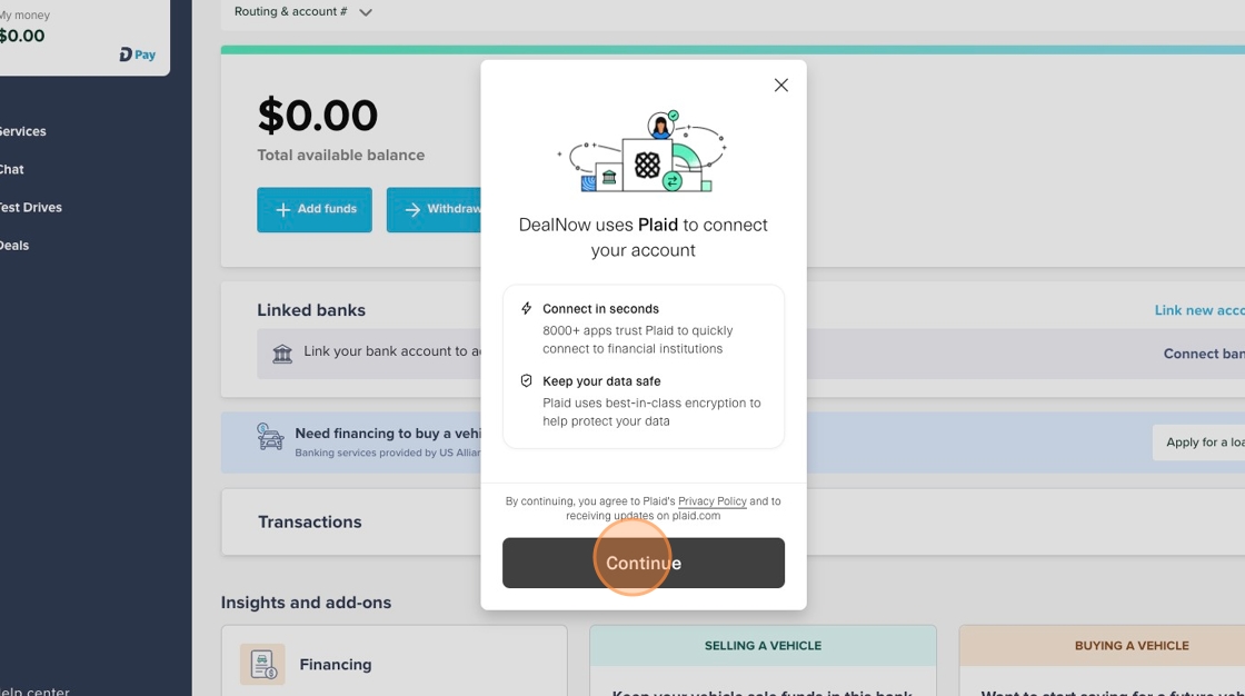 If you plan on purchasing a vehicle, it is in your best interest to onboard the funds you are using to pay for the vehicle as soon as possible, as it could take 1 to 6 days to fund your DealNow Pay account.