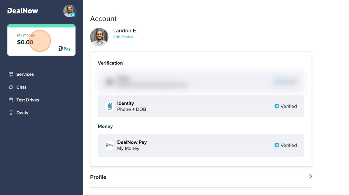 1. From the main account screen, press on either the white box found in the top left corner of the nav bar (the white box on the mobile version is found when you press the three lines at the top left corner of the screen) or on DealNow Pay under the "Verification" section.