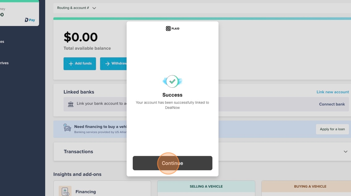 6. Click "Continue" on the pop-up stating your bank account has been successfully linked