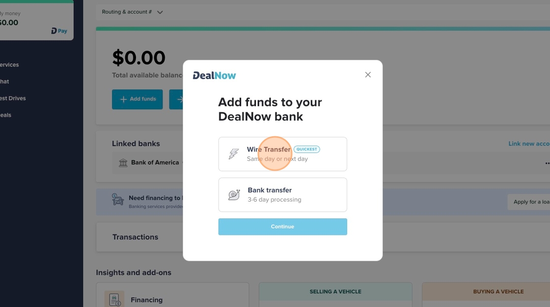 The information below explains how to initiate a wire or ACH transfer from the money page of your DealNow account.
