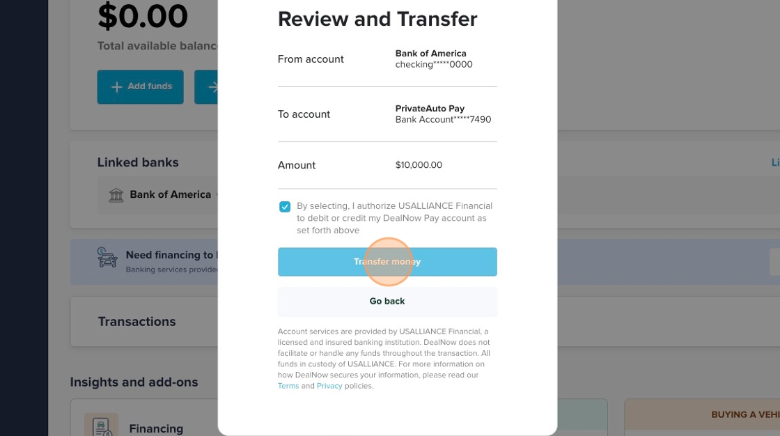 5. Click the check box to agree to authorize USALLIANCE Financial to add funds to your DealNow Pay account