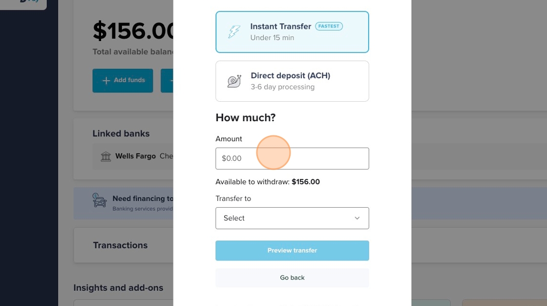 3. If your bank supports FedNow, you will see an "Instant Transfer" option that will allow you to transfer funds to your bank account in under 15 minutes