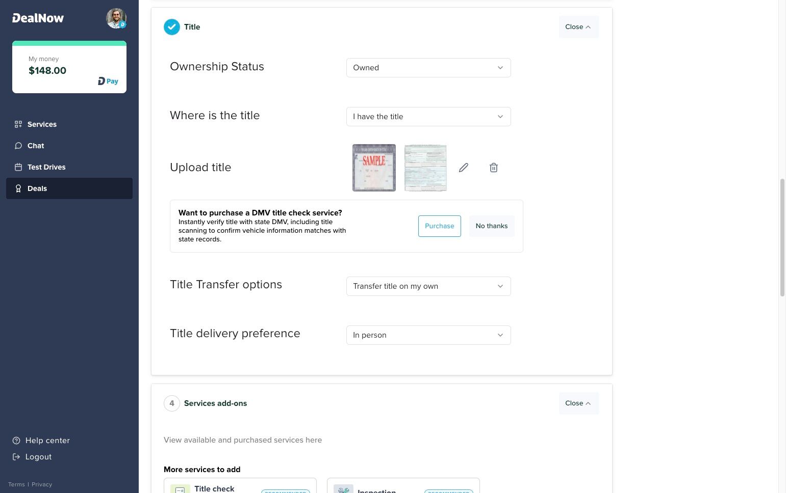 1. In Step 3 of the deal (the Title section), you can upload an image of the front and back of your title by clicking the "Add the title" button