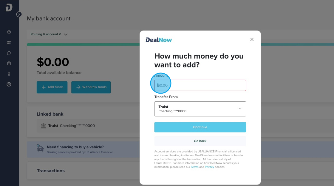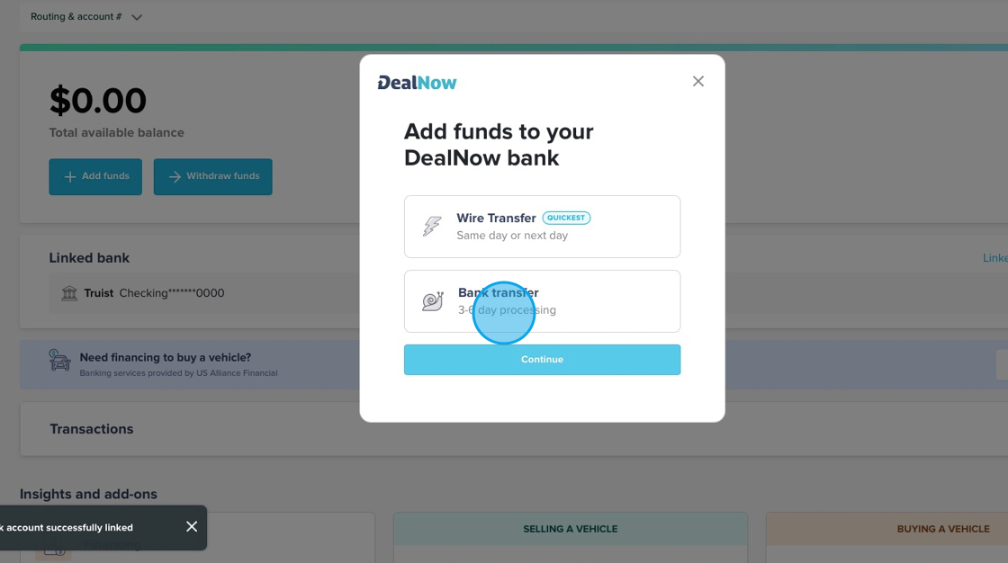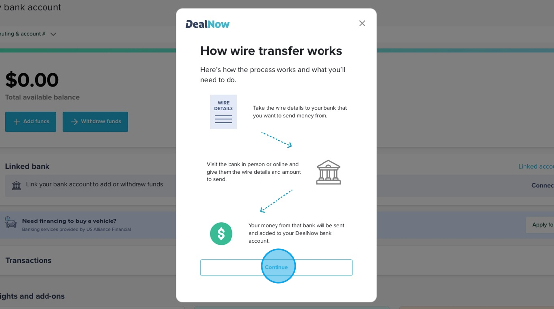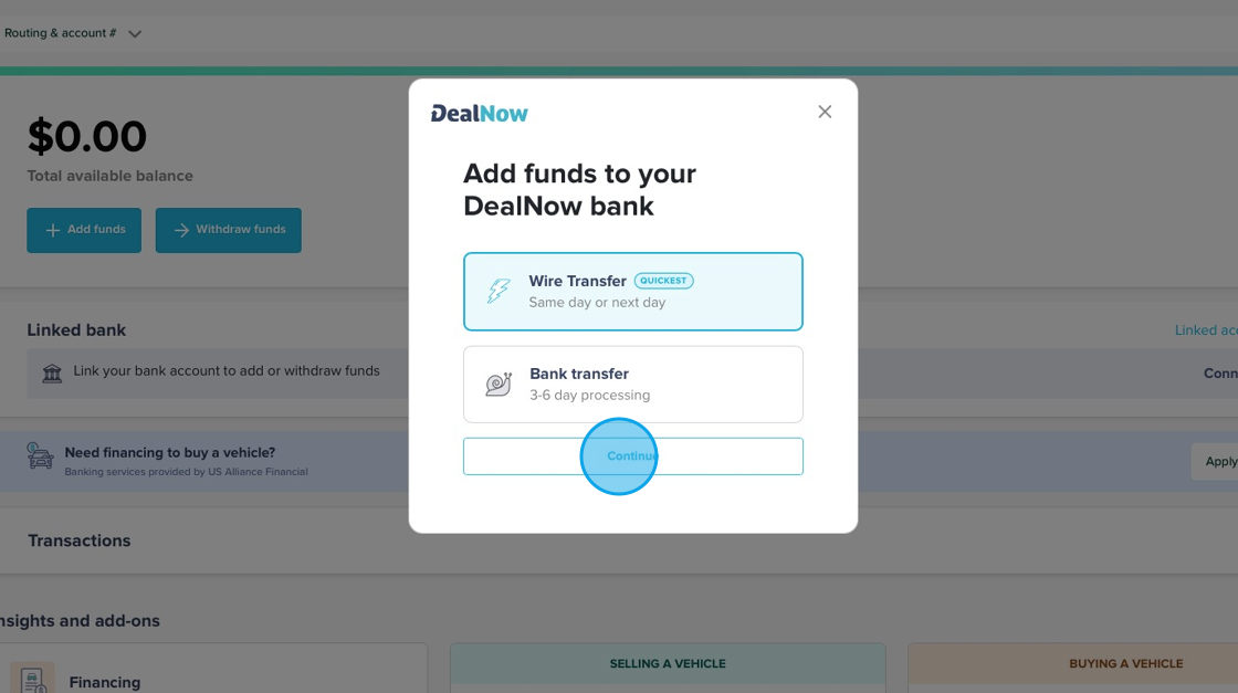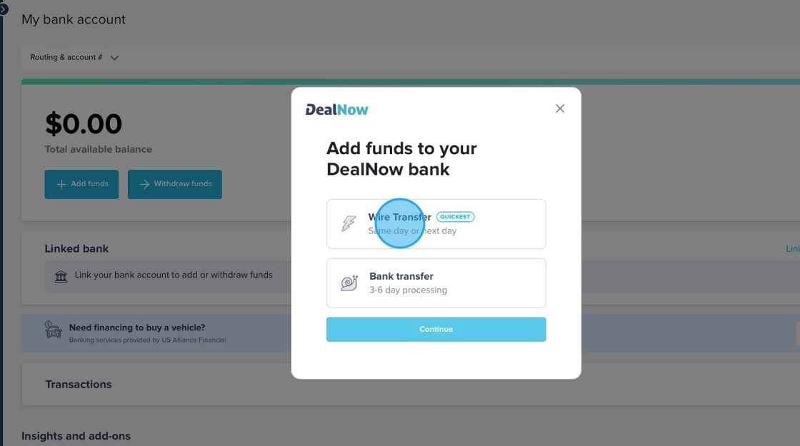 Tip: Bank transfer can take anywhere from 3-5 business days to process. If you choose this option you will need to add additional per diem in the event the funds don't clear before the 3 day window. We recommend adding at least 3 days of per diem to your total amount so your deal is not delayed.