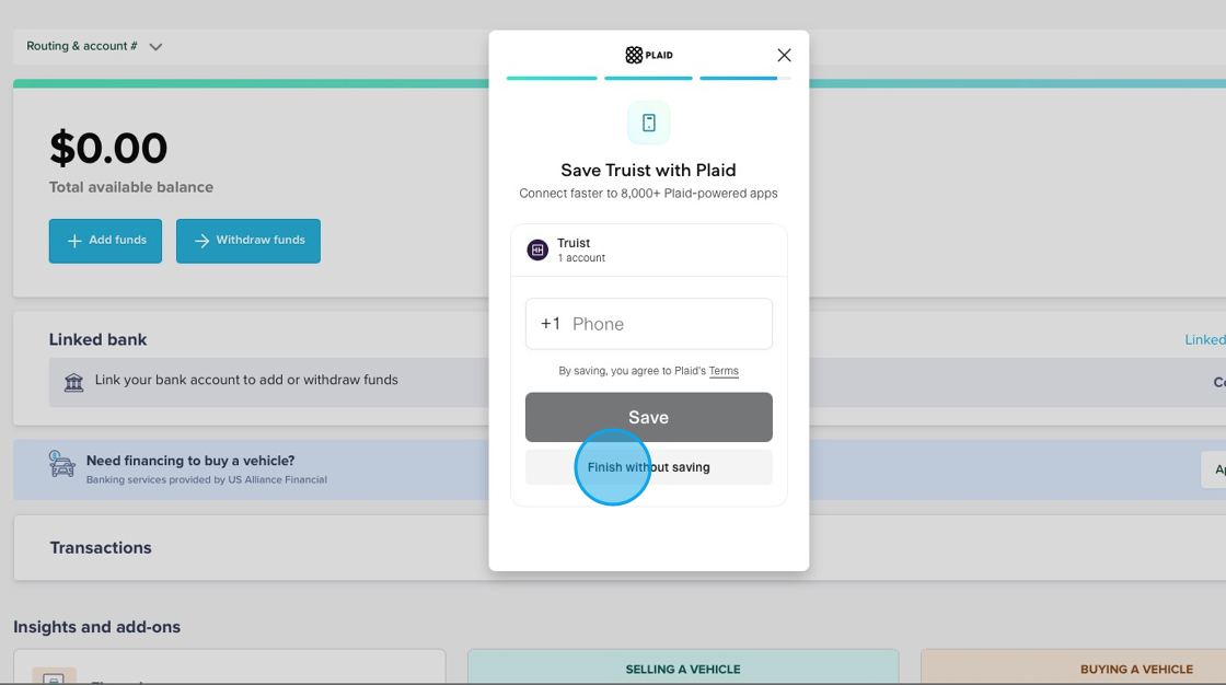 19. You can click "Finish without saving" or choose to save your info with plaid to complete connecting your bank.