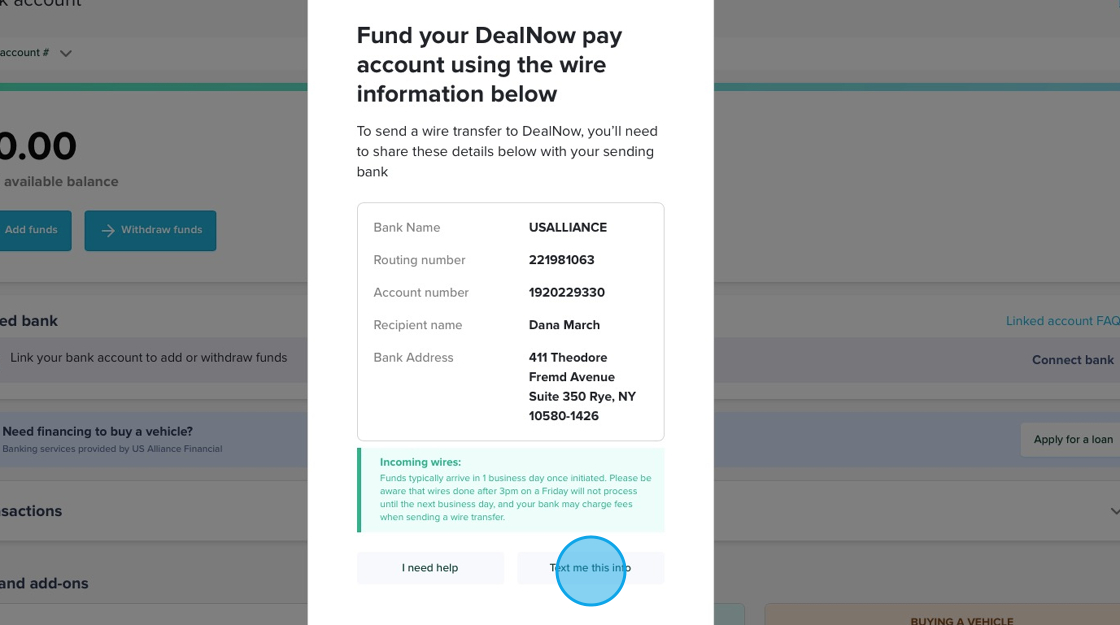 14. Click "Text me this info" so you can have the wire instructions texted to your phone. You can tae these instructions to the bank you wish to send the money from to initiate the wire.