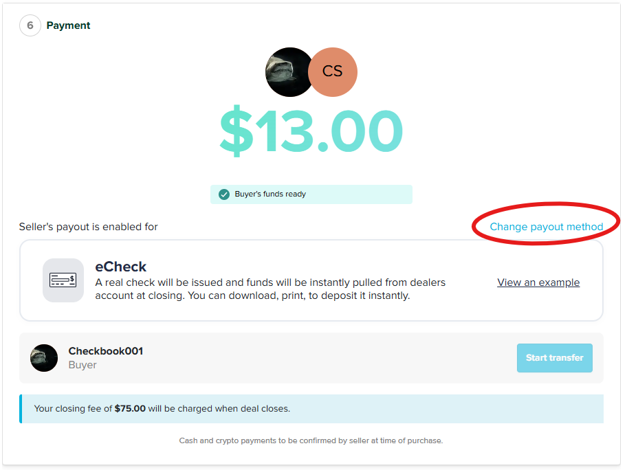Before the deal closes, the payout method can be updated in Step 6 – Payment by clicking “Change payout method.” If ACH is the only available option for the bank put in, the seller can also switch to it by selecting the payment logo on their side of the deal.