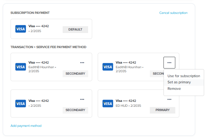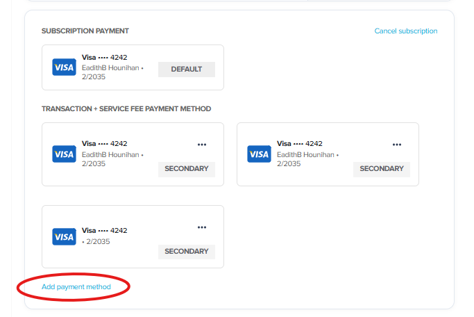 - Scroll to the Subscription Payment or Transaction + Service Fee Payment Method section.