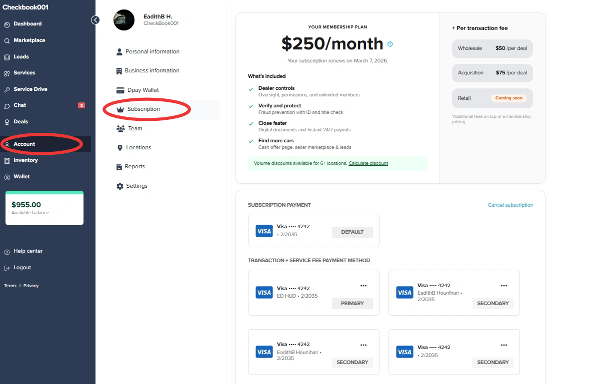 Quick Summary: Dealers can add a new card and set it as the default payment method at any time from the Subscription tab under Account. You can manage both your Subscription payment and your Transaction + Service fee payment method from this page.
